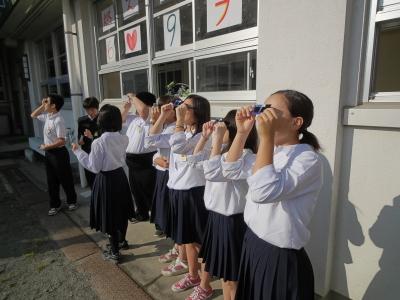 部分日食開始時は雲がかかっていましたが、金環日食時には晴天となり、生徒は観察に成功し、色々な実験を行いました。
